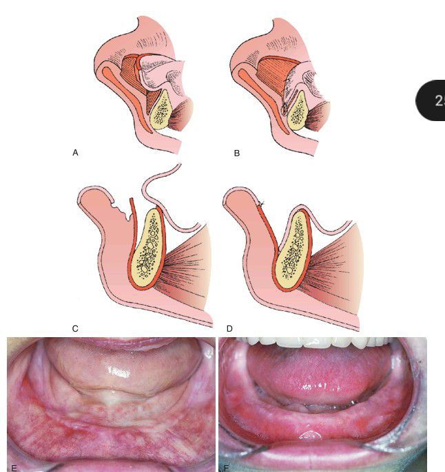 Transpositional flap vestibuloplasty (i.e., lip switch). (A) Incision is made in the labial mucosa, and a thin mucosal flap is dissected from underlying tissue. Supraperiosteal dissection is also performed on the anterior aspect of the mandible. (B) The flap of the labial mucosa is sutured to the depth of the vestibule. Exposed labial tissue heals by secondary intention. (C) Modification of technique by incising periosteum at crest of alveolar ridge and suturing free periosteal edge to denuded area of labial mucosa. (D) The mucosal flap is then sutured over denuded bone to the periosteal junction at the depth of the vestibule. (E) Preoperative photograph. (F) Result of surgery 6 months later.