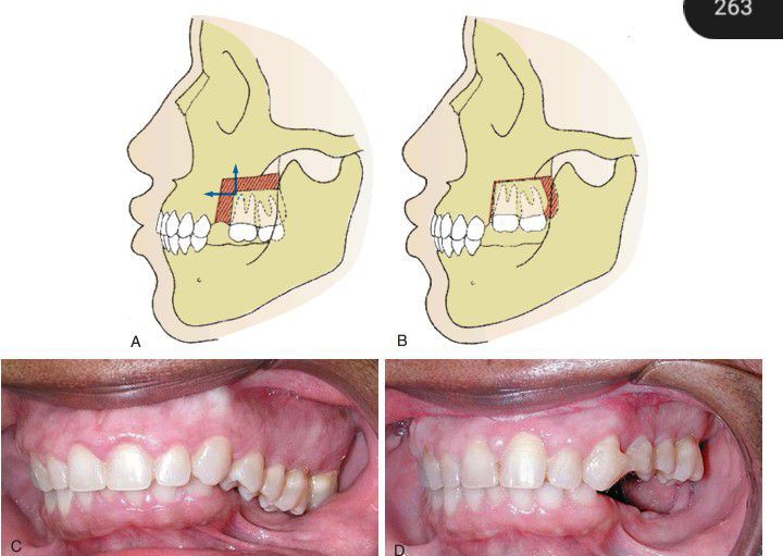 . (A–B) Posterior maxillary osteotomy for superior and anterior repositioning of the posterior segment of the maxilla. This improves the interarch space for implant placement or for the construction of removable partial dentures. (C) Clinical appearance of supraerupted maxillary teeth. (D) Postoperative view demonstrating superior repositioning of isolated segment to improve interarch distance.