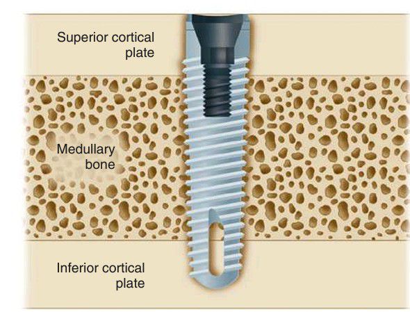 Whenever possible, implants should engage two cortical plates of bone. (From Rosenstiel SF, Land MF, Fujimoto J. Contemporary Fixed Prosthodontics. 4th ed. St. Louis: Mosby; 2006.)