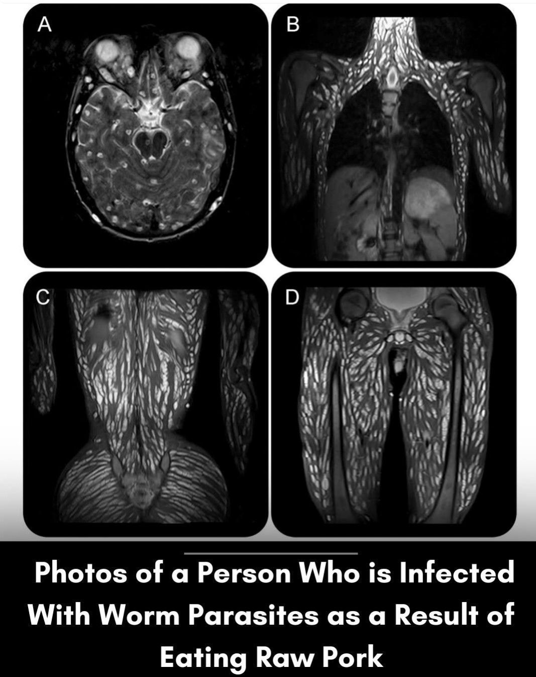 Photos of a Person Infected With Worm Parasites: The individual became ill after eating raw pork. The disease is also contracted through the ingestion of eggs found in contaminated food and water. Eating raw or undercooked pork can be dangerous due to the risk of parasitic infections such as trichinosis, caused by the roundworm Trichinella spiralis, and cysticercosis, resulting from the larval stage of the pork tapeworm, Taenia solium. This can lead to disseminated cysticercosis, which is a severe, widespread infestation of the parasitic disease caused by the larval stage of the pork tapeworm, Taenia solium. This condition occurs when the larvae disseminate throughout the body, affecting multiple organs and tissues, including the brain, muscles, eyes, and skin, leading to a wide range of symptoms depending on the location and burden of the cysts. Neurocysticercosis, where the larvae invade the central nervous system, is among the most serious manifestations, potentially causing seizures, headaches, and neurological deficits. Diagnosis involves imaging techniques like MRI or CT scans alongside serological tests, and treatment typically includes antiparasitic medications, corticosteroids to reduce inflammation, and sometimes surgery to remove cysts. Prevention strategies focus on improving sanitation, food safety, and public health education in endemic areas to reduce the transmission of Taenia solium. By: https://www.instagram.com/p/DG7XHsYviza/?utm_source=ig_web_copy_link&igsh=MzRlODBiNWFlZA==