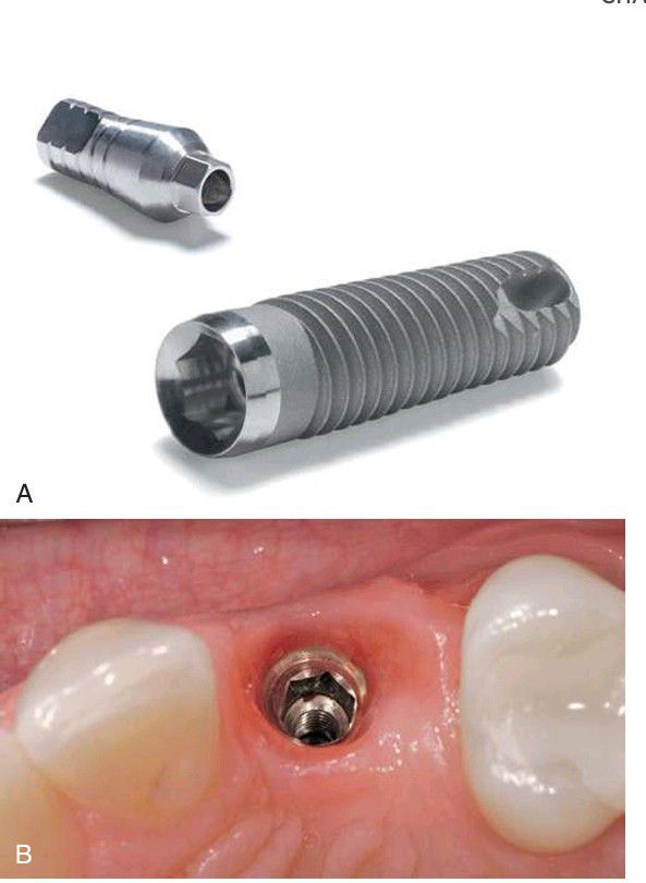 (A) Internally hexed Zimmer implant and titanium abutment. (B) Intraoral view of an internally hexed Zimmer implant after removal of the healing abutment. (A, Courtesy Zimmer Dental Inc., Carlsbad, CA.)