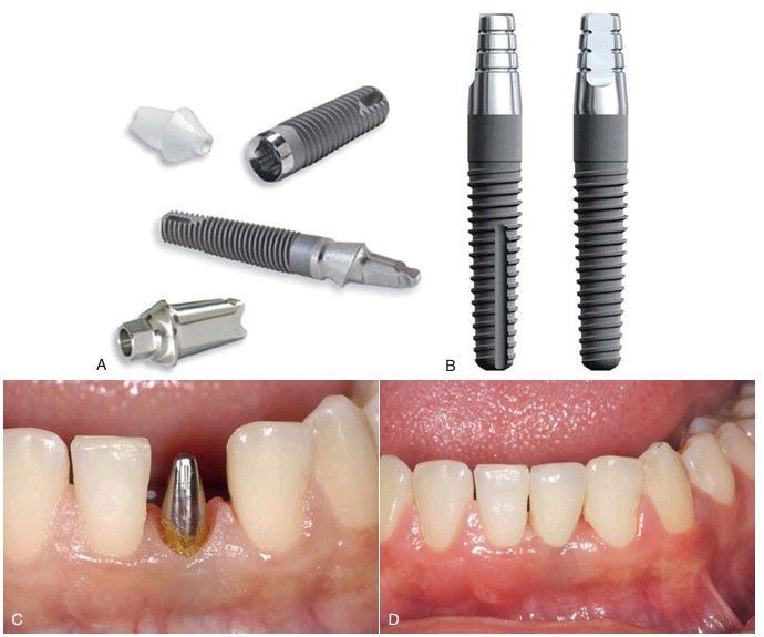 . (A) Two-piece implant and abutment (top) and a onepiece implant (bottom) (Zimmer). (B) One-piece implant (Nobel Biocare). (C) One-piece implant replacing tooth #24. (D) The final restoration of the implant replacing tooth #24. (A, Courtesy Zimmer Dental Inc., Carlsbad, CA. B, Courtesy Nobel Biocare USA, Yorba Linda, CA.)