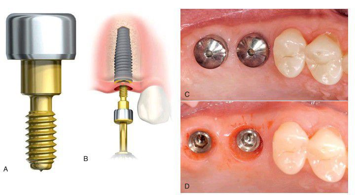 . (A) Nobel Biocare healing abutment. (B) A healing abutment being placed into the implant. (C) Two healing abutments in place. (D) Clinical view after the removal of the healing abutment. Note the way the tissue has been shaped by the contour of the healing abutment. (A–B, Courtesy Nobel Biocare USA, Yorba Linda, CA.)