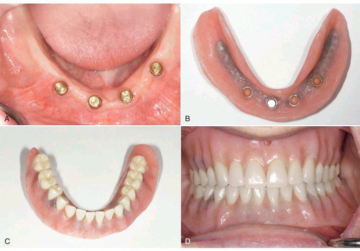 Implant and prosthetic treatment of the edentulous mandible with implant- and soft tissuesupported overdenture. (A) Four implants with locator attachments in place for an implant-retained overdenture. (B–C) The overdenture is reinforced with a cast metal framework. (D) The completed maxillary conventional denture opposed by a mandibular locator-retained overdenture.