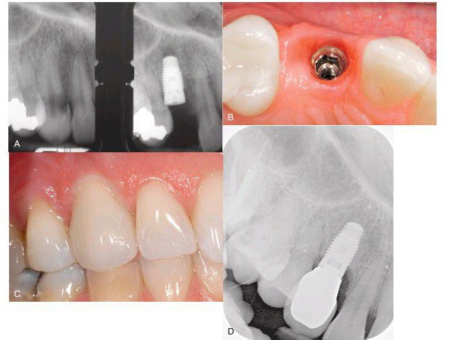 . (A) Radiograph showing nonrestorable tooth before extraction (left) and after (right) extraction with implant in place. (B) Implant after the uncovering and healing period and ready for restoration. (C) Final result. (D) Final radiograph.
