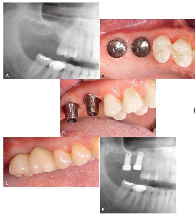 (A) Pretreatment radiograph. (B) Six months after implant placement and 3 weeks after uncovering placement of healing abutment. (C) Final abutment in place for cement-retained porcelain-fused metal (PFM) crowns. (D) Final cement-retained PFM crown restoration. (E) Final radiograph.