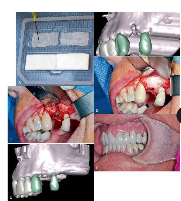 (A) Kit containing BMP in liquid form and collagen sponges. (B) Three-dimensional computed tomography (CT) showing edentulous space with facial wall defect. (C) Implant placed. (D) Allogeneic bone graft material combined with BMP on collagen sponge covering bony defect. (E) Three-dimensional CT showing excellent postoperative bone regeneration. (F) Restored implant.