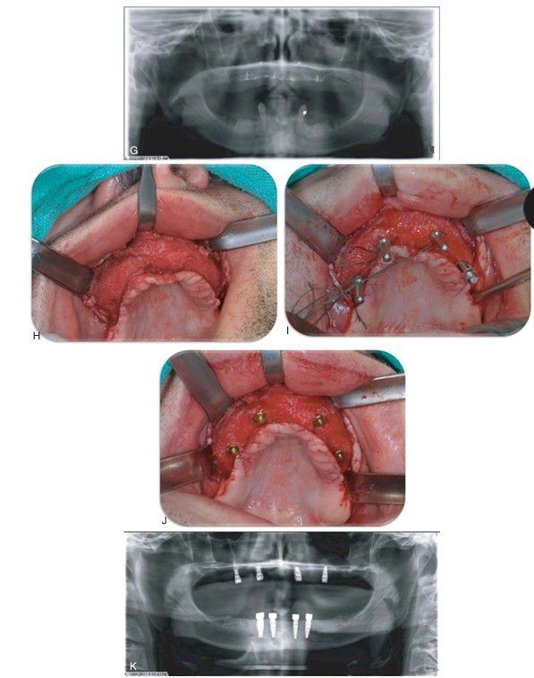 G) Postoperative Panorex of maxillary augmentation. (H) Surgical reentry 9 months after the grafting procedure. (I) Four direction indicators during implant placement at the time of titanium mesh removal. (J) Four implants placed into the regenerated bone with cover screws in place. (K) Postimplant placement Panorex.