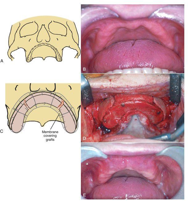 (A) Diagram of atrophic maxilla. (B) Clinical photograph illustrating inadequate alveolar ridge for reconstruction. (C) Three segments of bone are secured in place. (D) Stabilization of the onlay grafting with rigid fixation. Small defects are filled with cancellous bone and bone morphogenetic protein. A resorbable membrane is then placed over the graft prior to tissue closure. (E) Postoperative result demonstrating improved alveolar ridge height and contour.