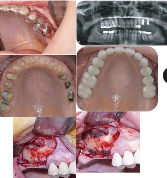 , cont’d (E) Implant placement using a surgical stent as a secondary procedure 5 months after the sinus augmentation was completed. (F) Postsurgical Panorex showing implant placement into the augmented left maxillary sinus. (G) Intraoral photo of prepared teeth and custom titanium implant abutments. (H) Final restorations in place. (I) Lateral bone window provides access; the sinus membrane is elevated and when enough native ridge is present for stability the implants can be placed at the time of sinus elevation. (J) Implants are placed through the native ridge and into the sinus.