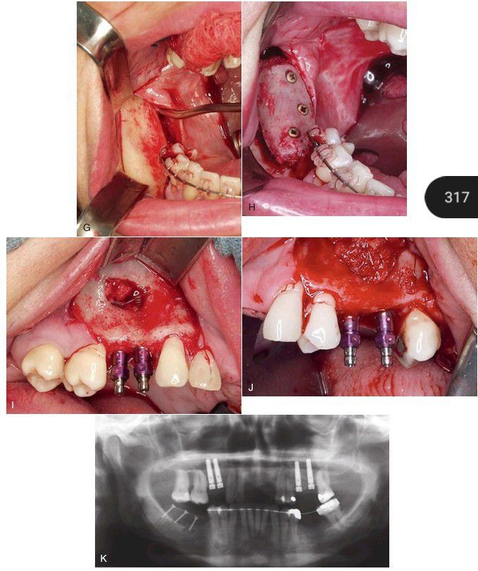 Surgical exposure of atrophic posterior mandible. (H) Fixation of the cortical bone graft. (I) Simultaneous implant placement and sinus lift prior to placement of the bone graft. (J) Completion of the graft placement in the maxillary sinus. (K) Panoramic radiograph after grafting.