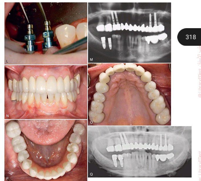, cont’d (L) Mandibular implant placement. (M) Radiograph after placement of mandibular implants. (N) Frontal view of the completed prosthetics. (O) Occlusal view of the completed maxillary prosthetics. (P) Occlusal view of the completed mandibular prosthetics. (Q) Final radiograph.