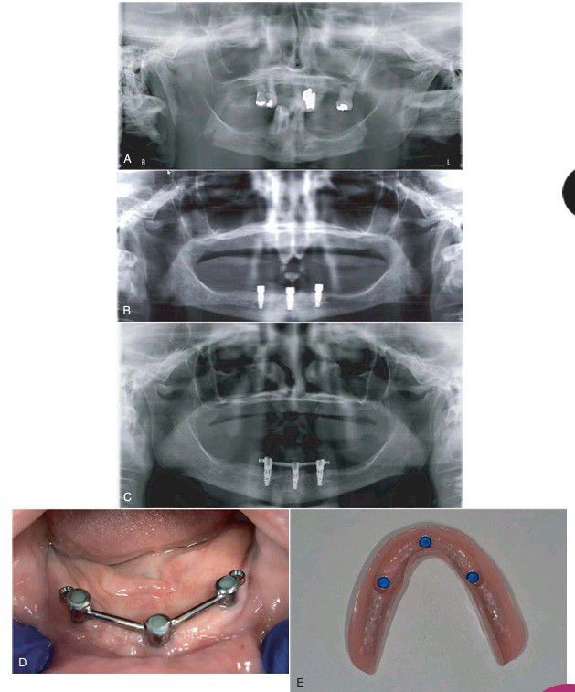 Failed maxillary and mandibular dentition with moderate atrophy of the mandible treated with conventional maxillary denture and mandibular overdenture. (A) Pretreatment Panorex. (B) Placement of three mandibular implants. (C) Panorex of titanium bar splinting three implants. (D) Implant-supported milled titanium bar with attachments. (E) View of the intaglio surface of the metal-reinforced final overdenture with attachments.