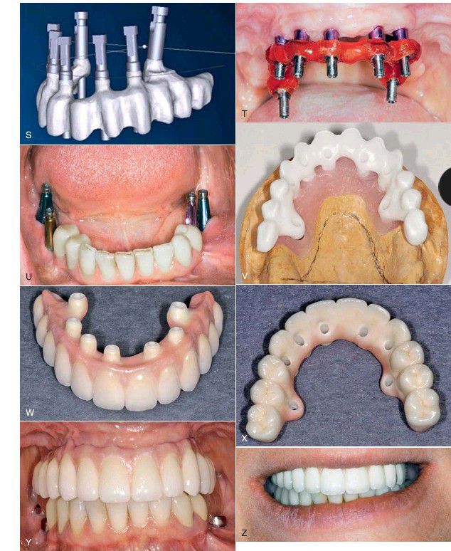 S) Computer design of planned zirconia framework for hybrid prosthesis. (T) Preparation for an open-tray transfer impression. (U) Impression transfers in place for impression of mandible. (V) Computer-aided design and computer-aided manufacturing zirconia framework. (W) and (X) Completed porcelain to zirconia hybrid prosthesis. (Y) Completed prosthetics. (Z) Patient’s smile at completion of treatment. (L, Courtesy Nobel Biocare USA, Yorba Linda, CA