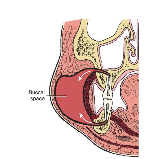 The buccal space lies between buccinator muscle and overlying skin and superficial fascia. This potential space may become involved via infection of maxillary or mandibular molars (arrows). (Modified from Flint PW, Haughey BH, Lund VJ, et al, eds. Cummings Otolaryngology: Head and Neck Surgery. 5th ed. Philadelphia: Elsevier; 2010.)