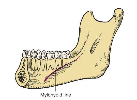 The mylohyoid line is area of attachment of mylohyoid muscle. Lingual cortical plate perforation by infection from premolars and first molar causes sublingual space infection, whereas infection from the third molar involves the submandibular space. (Modified from Flint PW, Haughey BH, Lund VJ, et al, eds. Cummings Otolaryngology: Head and Neck Surgery. 5th ed. Philadelphia: Elsevier; 201
