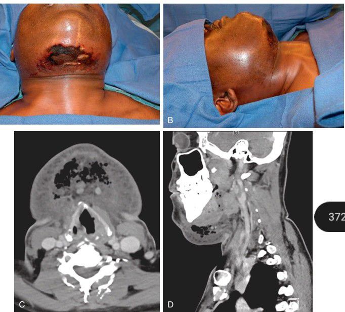 A–B) A patient who presented to the emergency department with bilateral chronic periapical odontogenic infections causing diffuse edema and overlying skin breakdown of the neck. (C–D) Computed tomography demonstrating destruction of the normal anatomic fascial planes of the neck.