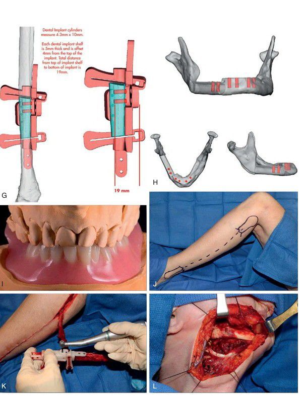cont’d (G–H) Virtual surgical planning. (I–K) Free fibula flap reconstruction. (L) Dental implant placement and reconstruction plate placement.