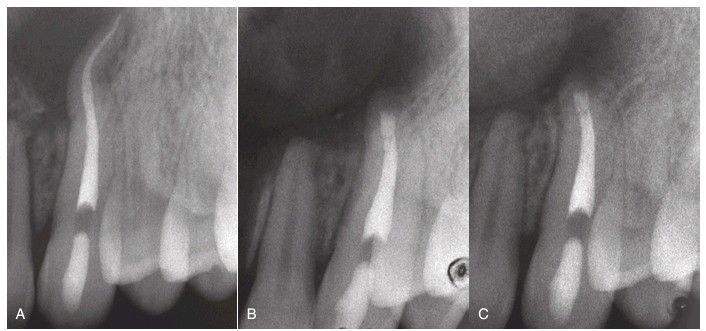 (A) Anatomic problem of a severe root curvature, for which surgery is indicated. (B) Apical resection and root end retrograde mineral trioxide aggregate the seal. (C) An image taken 4 months after surgery shows regeneration of bone.