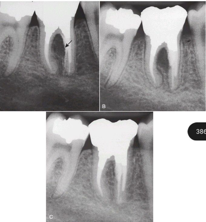 (A) Furcation perforation results in extrusion of material (arrow) and pathosis. (B) After flap reflection and exposure, the defect is repaired with mineral trioxide aggregate. (C) Evaluation at 2 years shows successful healing