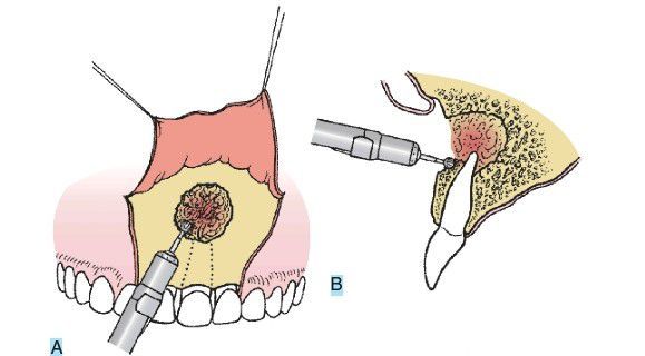 . A large round burr is used to “paint” the bony window. Enough bone is removed to give good visibility and access to lesion and apex. (A) Frontal view. (B) Cross-section.