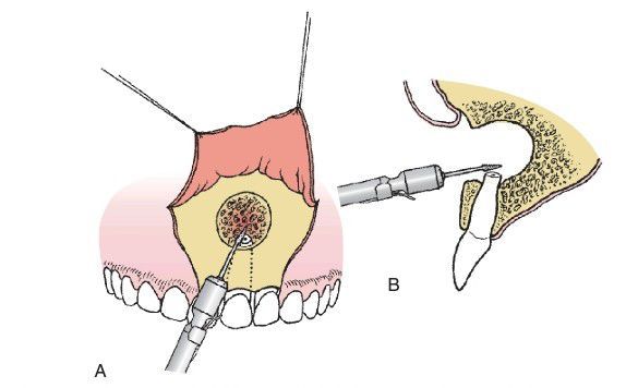 . Approximately one third of apex is removed with tapered burr. Amount removed and degree of bevel varies according to situation. (A) Frontal view. (B) Cross-section