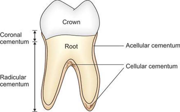 Cementum is a specialized, calcified tissue that covers the root of a tooth, acting as an anchor for the periodontal ligament, which attaches the tooth to the alveolar bone. Here's a more detailed breakdown: Function: