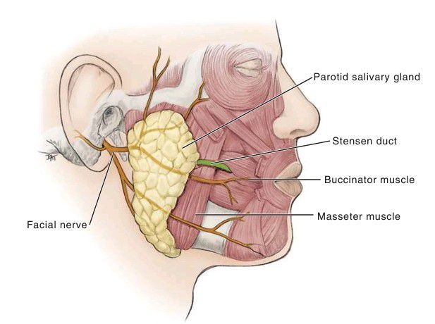 The facial nerve branches divide the gland into superficial and deep lobes. The Stensen duct courses superficial to the masseter muscle then curves sharply to pierce the buccinator muscle and enter the oral cavity.