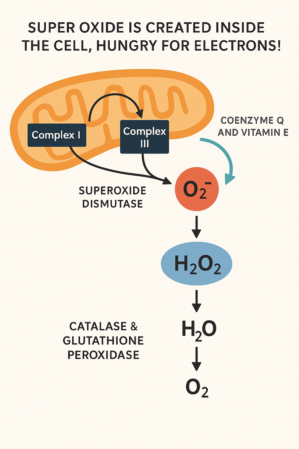 Here's the diagram illustrating the production of superoxide (O₂•⁻) in the electron transport chain and its neutralization, showing how it transforms into hydrogen peroxide (H₂O₂) and eventually into water (H₂) and oxygen (O₂) with the help of antioxidants like CoQ10 and Vitamin E.
