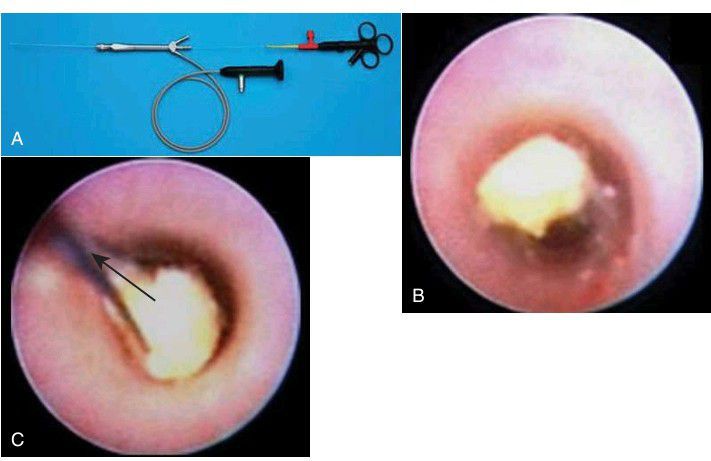 (A) Salivary gland endoscope with ports for visualization, illumination, irrigation, and instrumentation. (B) Endoscopic view of a stone on the ductal system. (C) Endoscopic retrieval of a stone with a mini-forceps grasper technique (arrow).