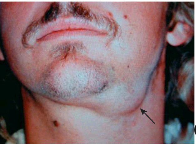 Left submandibular edema (arrow) caused by obstruction from a submandibular sialolith.