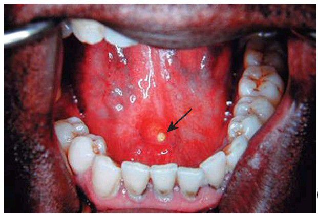 Stone at the orifice of the Wharton duct that is amenable to intraoral removal (arrow).