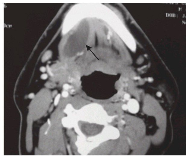 Right plunging ranula through the mylohyoid muscle seen on computed tomography scan (arrow)