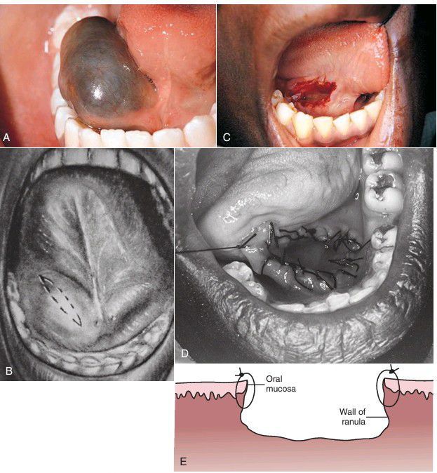 A) Ranula in the right floor of mouth from accumulation of sublingual gland saliva in soft tissue due to ruptured salivary duct. (B) Elliptical marsupialization incisions. (C) Marsupialization of ranula, with excision of oral mucosa together with the superior wall of ranula. (D) Completion of marsupialization of left floor of mouth ranula with placement of circumferential sutures. (E) Completed marsupialization with ranula lining sutured to floor of mouth mucosa.