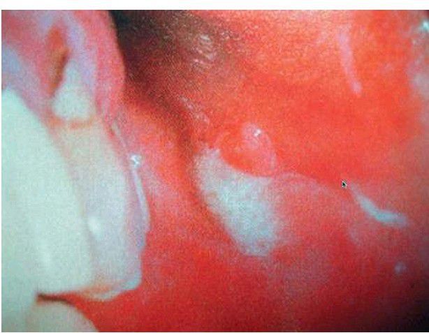 Purulent discharge from the left Stensen duct in a patient with an infection involving the left parotid gland.