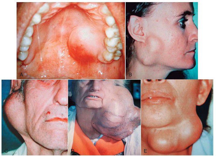 .sites of pleomorphic adenoma (A) Palate. (B–D) Parotid gland. (E) Submandibular gland.