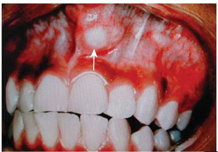 Monomorphic (canalicular) adenoma of the left upper lip or vestibule (arrow).