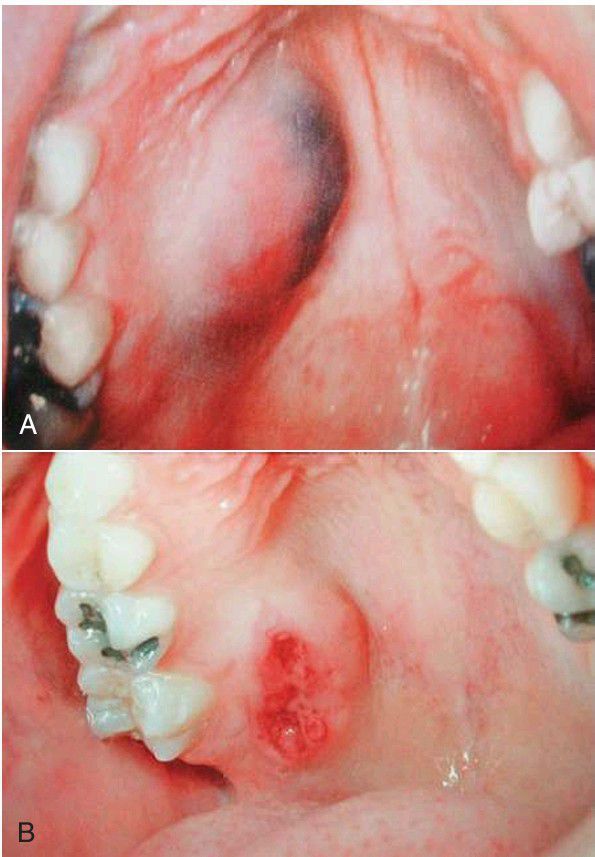 (A) Mucoepidermoid carcinoma of the palate. Note the bluish color from mucin content. (B) Mucoepidermoid carcinoma of the palate with ulceration.