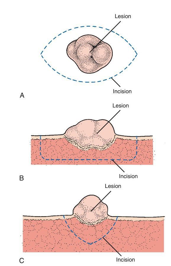 . (A) Surface view. An elliptical incision is made around the lesion at least 3 mm away from the lesion. (B) Side view. The incision is made deep enough to remove the lesion completely. (C) End view. Incisions are made convergent to the depth of the wound. Excision made in this way facilitates closure