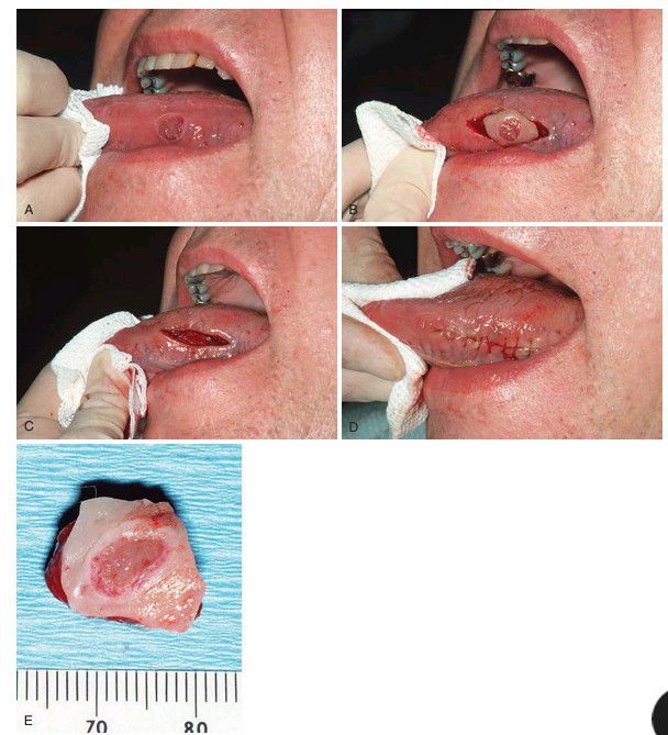 (A) Excisional biopsy of a tongue ulcer. (B) Elliptical incisions are made around the lesion, with 2 to 3 mm of normal tissue included. (C) Appearance after the specimen has been removed and the muscle has been sutured. Note that the deep sutures have made an almost linear closure of the mucosa possible. (D) Appearance after mucosal closure. (E) Specimen.