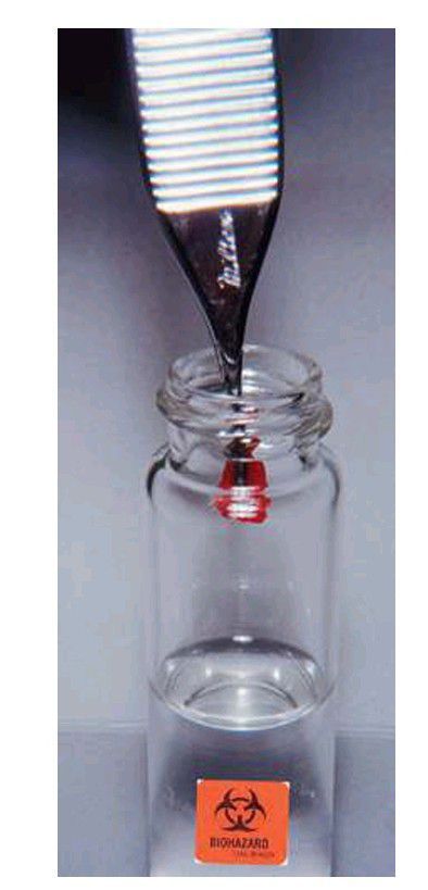 A specimen being dropped into a biopsy bottle filled with formalin.