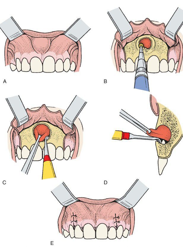 (A) Mild swelling in the area of a periapical cyst. (B) A mucoperiosteal f lap is elevated from around the necks of teeth, and a burr is used to remove thinned cortical bone overlying the cyst. Care is taken to prevent rupturing of cystic contents during this and the following steps. (C–D) A spoon-type curette is used to strip the cyst from bone. Note that the concave side of the curette is kept in contact with the bone. The convex surface is the working end of the instrument. (E) Closure.