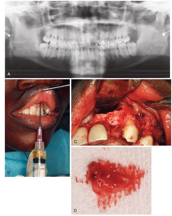 (A) Panoramic radiograph showing a large radiolucency in the left maxilla. (B) Aspiration of a lesion by passing a needle through the mucosa and thin bone over the lesion, revealing straw-colored fluid. (C) After raising a soft tissue flap and removal of bone in the area of the lesion. (D) Removal of a specimen for pathologic examination.