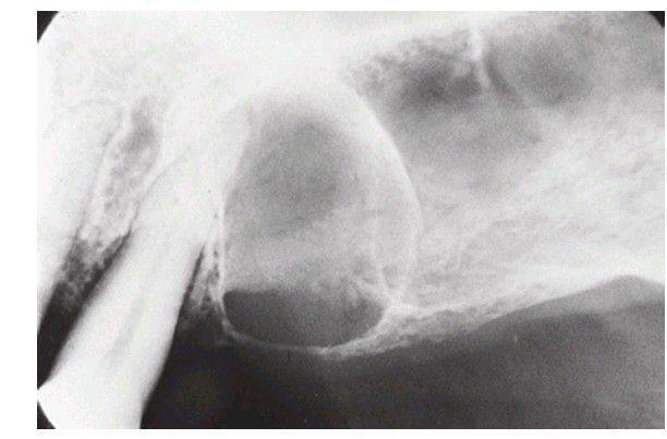 Typical radiographic appearance of cyst. The radiolucent center is surrounded by a zone of reactive bone (condensing osteitis)