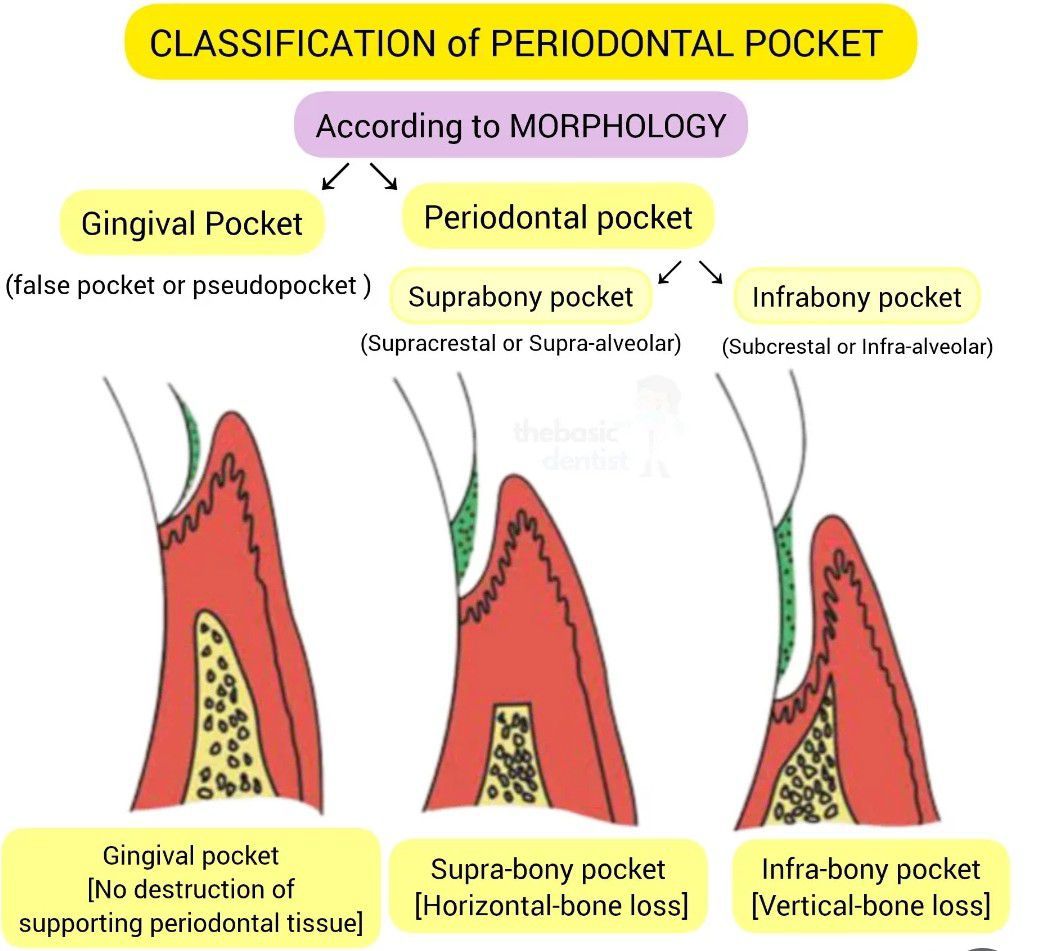 Periodontal pockets are classified as gingival, suprabonny, or infrabony depending on their location relative to the alveolar bone crest.