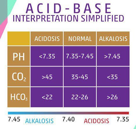 The following are the most important normal values on an ABG: pH = 7.35 to 7.45. pCO2 = 35 to 45 mmHg. pO2 = 75 to 100 mmHg.
