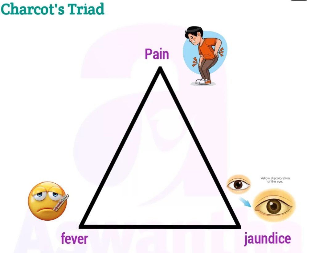 Charcot's triad: (1) RUQ pain, (2) jaundice, (3) fever and chills. The classic Charcot's triad is seen in only 50% to 70% of cases. 2. Reynolds' pentad may be seen: Charcot's triad + shock and mental obtundation.