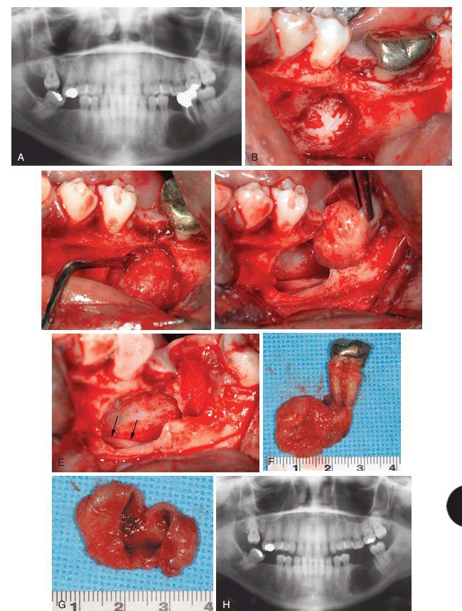 A clinical case of apical cystectomy performed at time of tooth extraction. (A) Pretreatment panoramic radiograph showing large radiolucent lesion at the apices of teeth No. 18 and 20. (B) Incision designed to ensure that the incisions are located over intact bone after cystectomy. (C) Appearance of the lesion after the buccal flap is elevated. Note that the lesion has eroded the bone. (D) Curette used to elevate the lesion from the bony walls. (E) Cyst being removed. (F) Note the inferior alveolar neurovascular bundle passing along the inferior aspect of the bony cavity. (G) Surgical specimen. (H) When opened, the specimen appeared to be cystic. The patient should be monitored with periodic radiographs to ensure bone fill and no recurrence of the lesion.