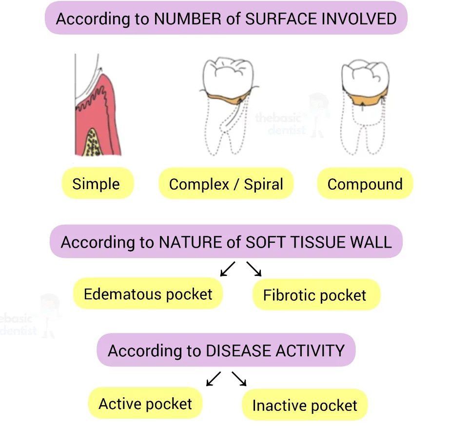 A periodontal pocket is a gap that forms between the gums and the root surface of your tooth. In a healthy mouth, the gingival (gum) tissue covers the bone, ligaments and other connective tissue that hold your teeth in place. Classification of Periodontal Pocket based on the number of surfaces involved is mentioned here.