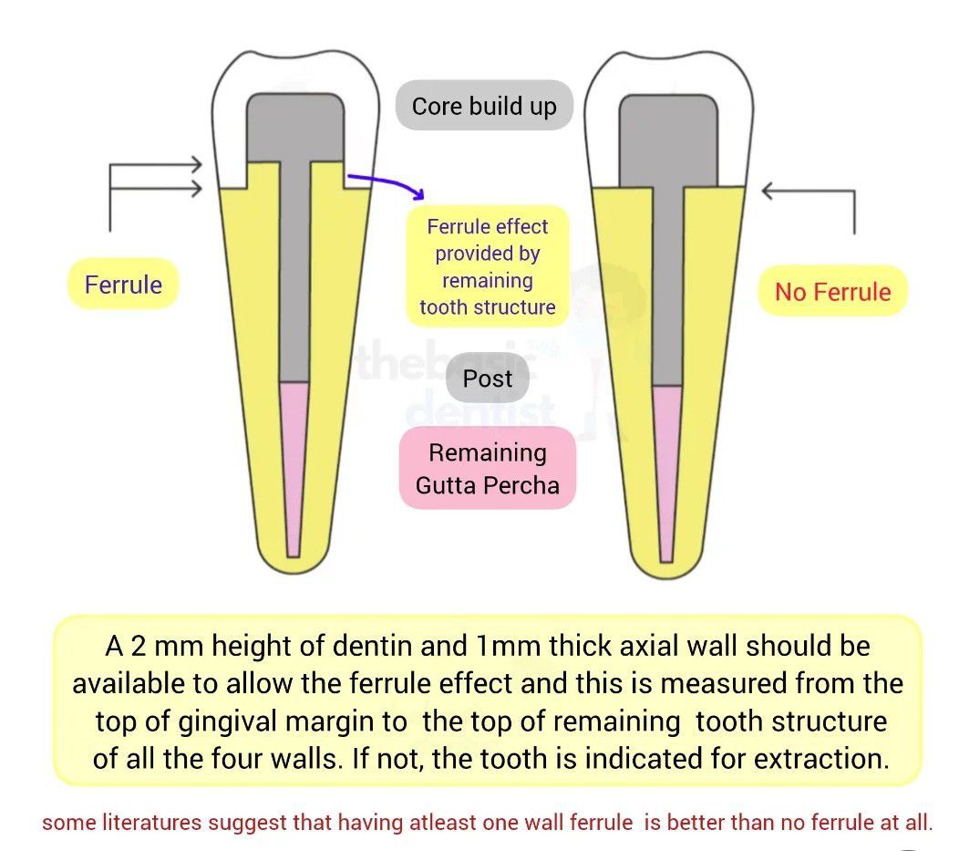 A ferrule effect is described as a band that extends the external dimension of a residual tooth structure.A 2-mm tooth structure should be available to allow a ferrule effect.